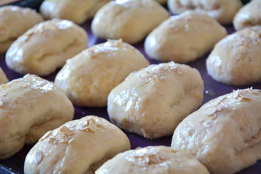 - Затем вновь дать булочкам подняться, аккуратно смазать их взболтанным яичком и поставить в разогретую духовку на 40-50 мин. при температуре 180 градусов.