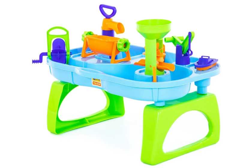 В жаркую погоду «заходит» на ура. Некоторые родители целенаправленно берут его для игр на даче, другие ставят в ванную, кое-кто в комнату и уверяет, что «никаких луж». По сути это пластмассовый стол, на котором расположены водные аттракционы: мельница, насос, подъемный кран, шлюзы для воды. И конечно, в нем с удовольствием купаются и другие маленькие игрушки.