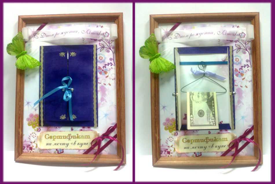 Можно подарить сертификат на мечту, изготовленный в виде шкафчика. Это преимущественно женский подарок, так как представительниц прекрасного пола гардероб, как правило, интересует больше. При открытии шкафчика счастливая именинница увидит заботливо вывешенную банкноту.