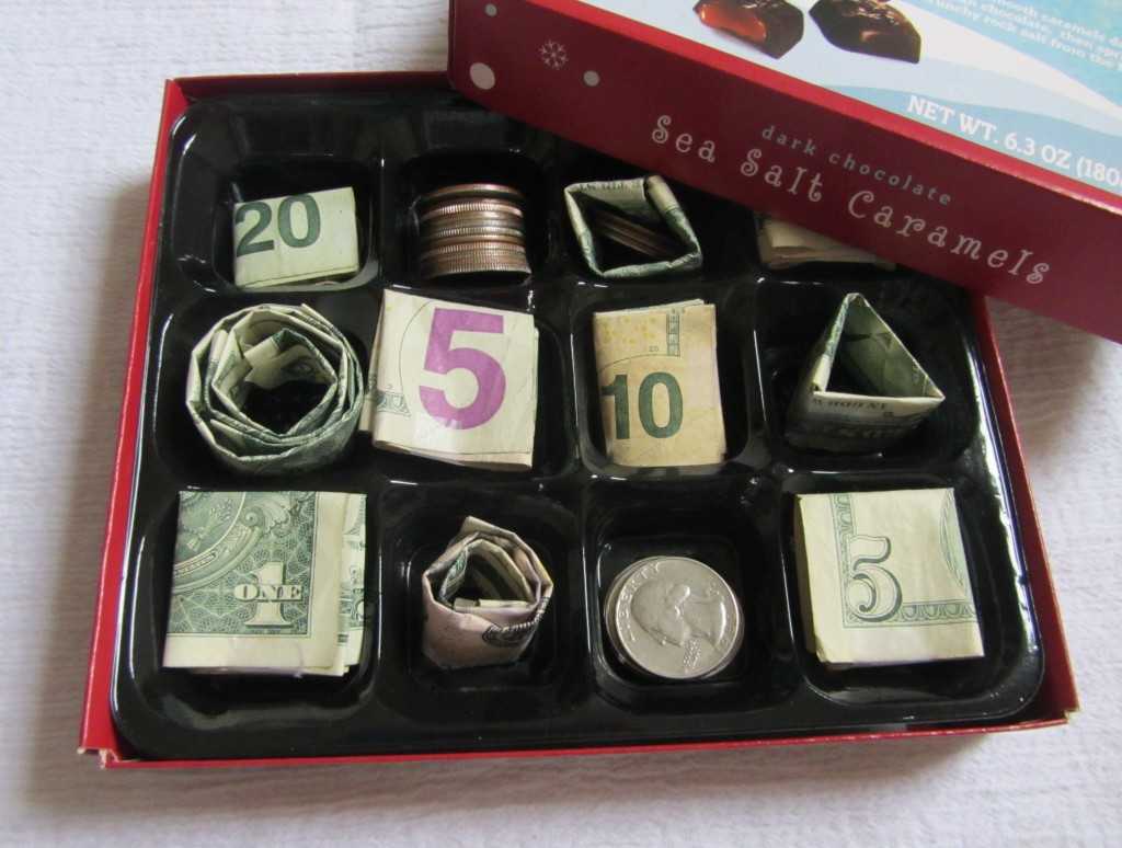 Такой сладкий подарок многим кажется простым и банальным, но при правильном подходе сюрприз получится приятным и неожиданным. Купив коробку конфет, можно все сладости заменить сложенными денежными купюрами. В идеальном случае используются деньги разной валюты и значения.