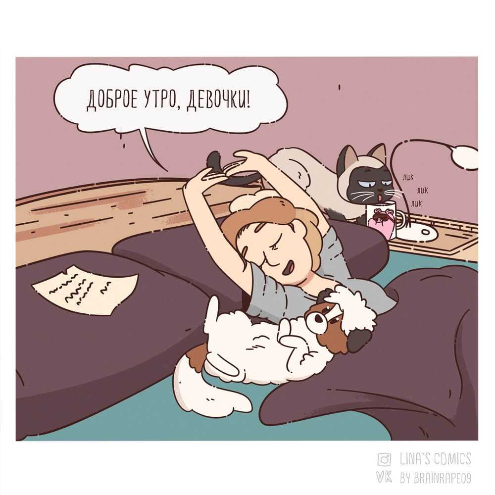 Самые первые комиксы, которые начала рисовать Лина после долгого перерыва, были про ее питомцев – собаку Няшку и кошку Буську. «Потом в доме “завелся” мужчина, и я стала рисовать о нем», – шутит девушка.