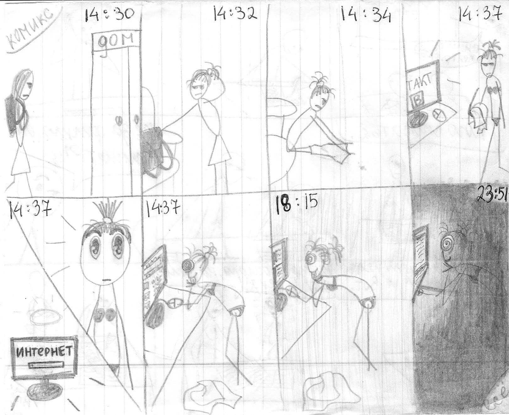 – Что нас смешило в 8–10 лет, то и рисовали, – рассказывает девушка. – Например, про хомячков Вики, которые умирали настолько нелепо, что заслужили премию Дарвина. Или зарисовки про перлы одноклассников, бородатые анекдоты и просто какие-нибудь глупости.