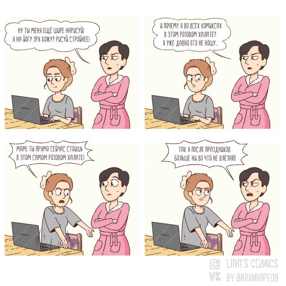 Кстати, мама и свекровь – фанаты Лины номер один. Они первыми ставят лайки, делятся новыми комиксами с друзьями. Елена Николаевна в рисованных историях дочери появляется часто. И в основном – в розовом халате.