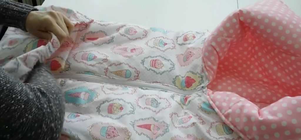 - разделите верхний край конверта пополам, из центральной точки, но не до самого кромки, вшейте застёжку – «молнию». В застёгнутом виде получается спокойный капюшон для маленькой головки;