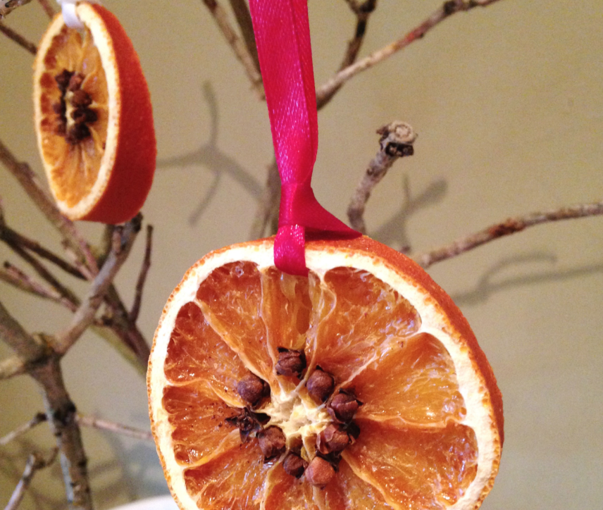 После того, как вы насушили апельсиновые слайсы, дело остается за малым. Возьмите гвоздику и украсьте ею по кругу серединку каждого цитрусового кружочка. Почувствовали аромат? Скоро он будет радовать вас аж до Нового Года!