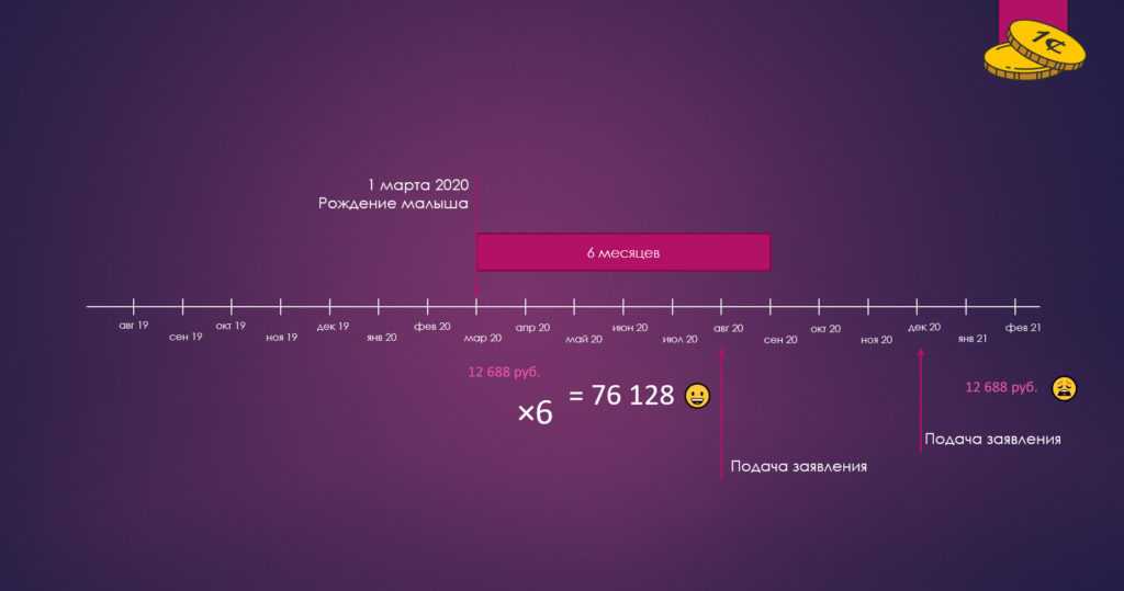 Очень желательно сделать это в первые 6 месяцев после рождения ребёнка: если вы подадите заявление на 6 месяце жизни вашего малыша, то вы получаете пособие не только за текущий месяц, но и также за 5 предыдущих. В противном случае, если вы подаёте заявление в любой другой момент, вплоть до того, как ребенку исполнится 3 года, то и получать пособие вы будете с даты подачи заявления: