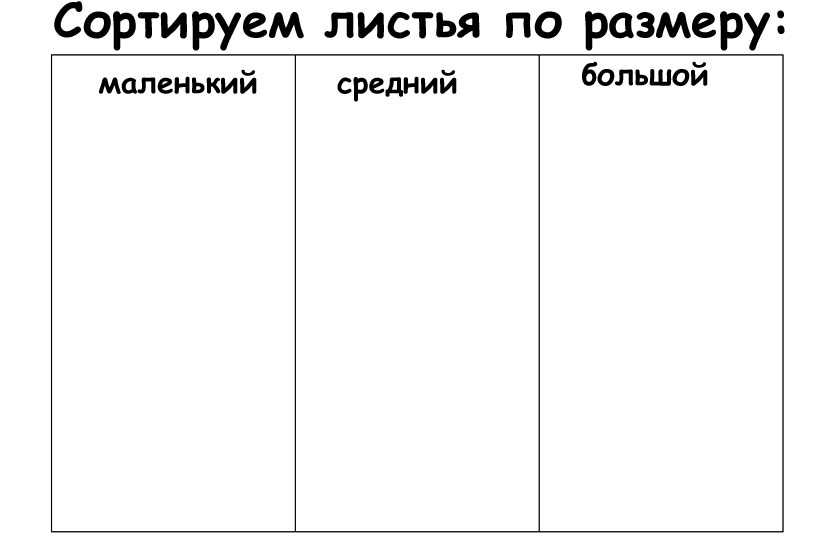Сортируем листья по размеру: большой, средний и маленький. Распечатываете, разрезаете на карточки листочки и сортируете их по размеру. Удачи)