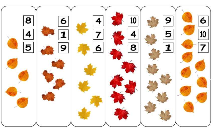 Распечатываете картинку с осенним листом, разрезаете на карточки и прикладываете к листу с цифрами.