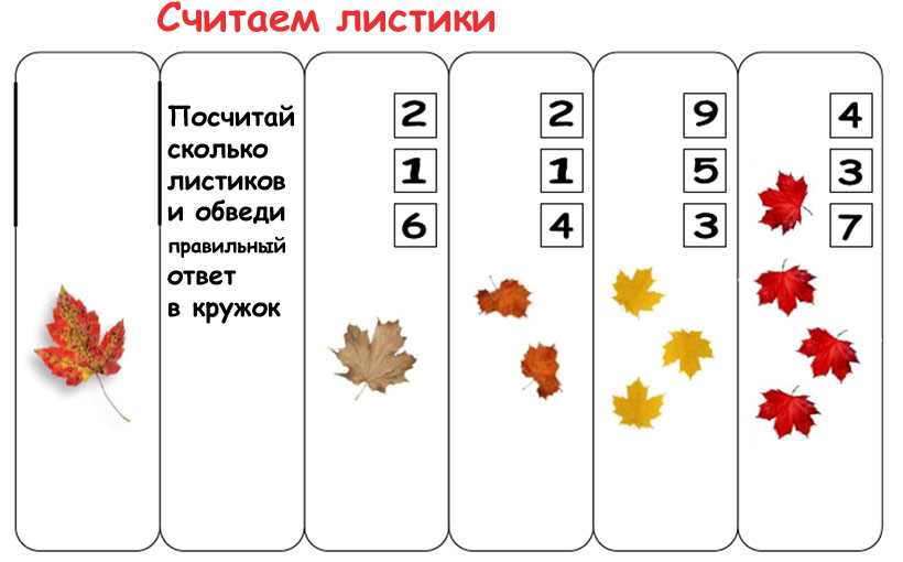 Еще одно осеннее занятие или игра — считаем листики и обводим правильный ответ в кружочек.