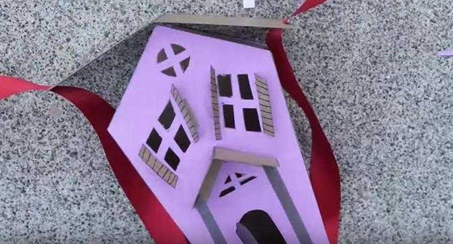 Ленточка будет удерживать крышу домика. Сверху завяжите бантик.