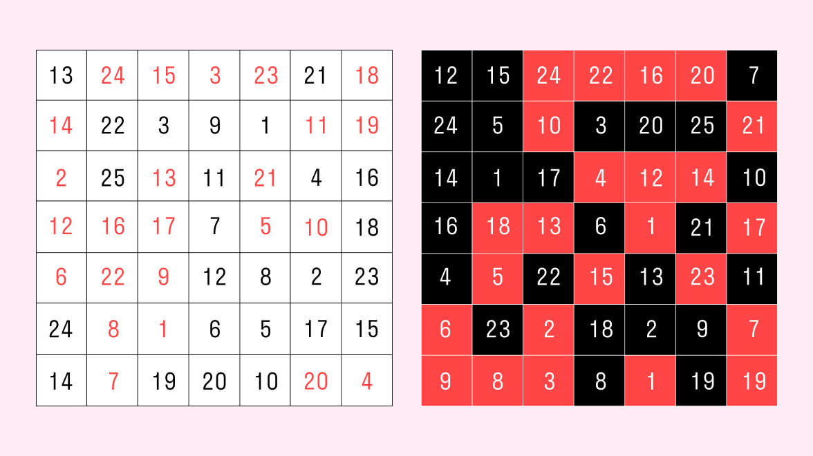 Помимо черно-белых карточек, есть также варианты другого цвета — например, красно-черные таблицы Горбова-Шульте, которые часто используются в школах скорочтения для взрослых и детей. Принцип работы с ними аналогичен: не искать цифры, перебирая их глазами, а стараться увидеть таблицу целостно, замечая нужную ячейку периферическим зрением.