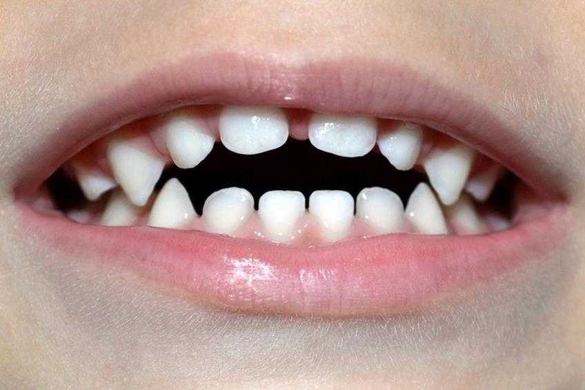 Адентия (отсутствие зачатков некоторых молочных зубов), патологии строения челюсти или языка. В этом случае зубы изначально не могут прорезаться правильно.