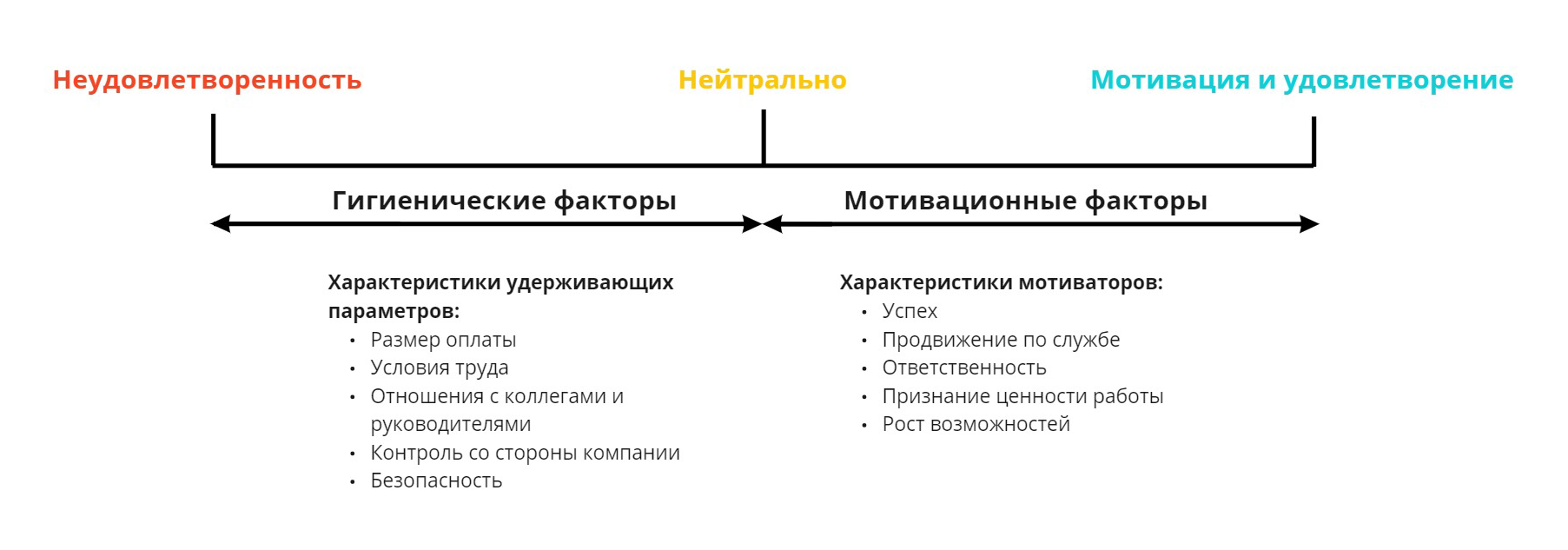 Двухфакторная теория Фредерика Герцберга направлена на изучение оценки удовлетворенности от выполненной работы. Он исследовал анкеты сотрудников компаний и пришел к выводу, что только два фактора влияют на них: мотиваторы и удержание, также называемое гигиеническими факторами.