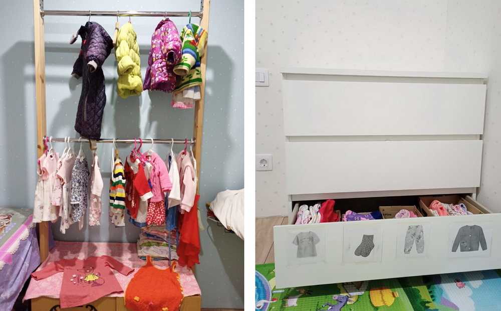 Самостоятельно одеваться. Готовлю пространство, собираюсь приобрести стульчик для зоны одевания. Проговариваю вслух, что именно мы надеваем и для чего: после сна, на сон, на прогулку. В дальнейшем будем активно практиковать, чтобы к весне уже пришёл интерес в данном направлении по одеванию.