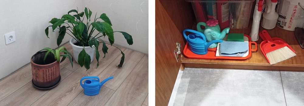 Наводить порядок. Сначала мы вместе полили все цветы в доме, а затем выбрали самый большой горшок, который нужно часто и обильно поливать. Энтузиазм был на лицо, даже капли по дому вытирали после упражнения. Пробовали подметать пол, но щётку ещё держать тяжело. Рука не привыкла — надо тренировать крупную моторику.